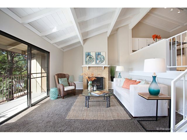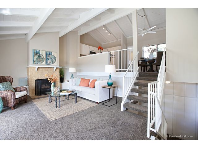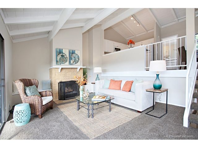 La Costa Gem! Chic and contemporary town home. FHA & VA approved. Desirable end unit location, no neighbors on one side. Spacious, open kitchen with granite counter tops, new hardware & hinges on cabinets and gas range. Updated shower surround in downstairs bath. Powder room with beautiful granite counter, newer faucet and tile floors. Fresh paint throughout. Vaulted ceilings and painted brick fireplace facade, decorative mantle and built in storage benches. Attached 2 car garage with "man cave".