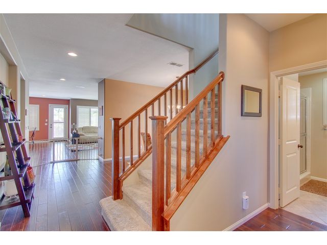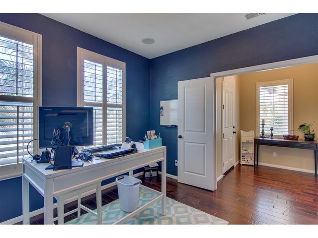 CALAVERA HILLS DREAM ON CORNER LOT! Rich hardwood floors flow throughout the downstairs of this beautiful, move-in ready home. Spacious family room features a cozy gas-burning fireplace with raised hearth, ceiling fan, and built-in entertainment center. Opening to the kitchen, this beauty offers an excellent entertaining space. Whip up a gourmet meal in the chef's kitchen that boasts deep mocha cabinets, granite slab counters with full splash, five burner gas cooktop, prep island with eat-at counter.