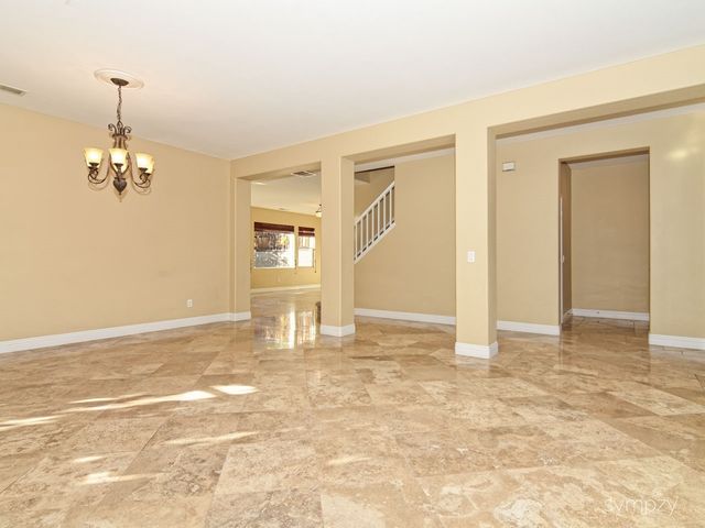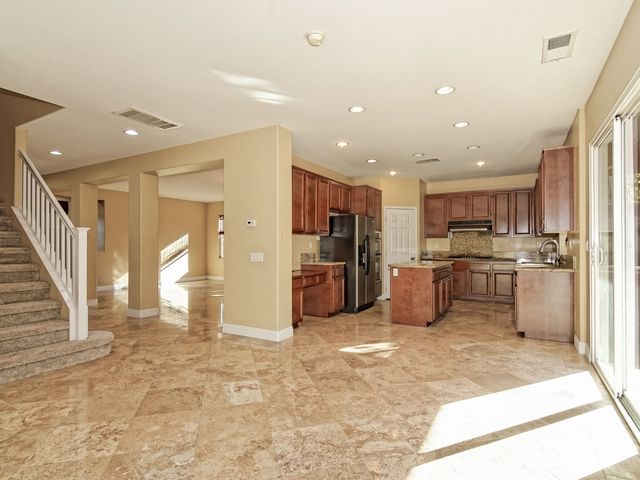New paint, new carpet upstairs, CLEAN and move in ready! 4-bedrooms, 3-baths, 2,785 sq.ft with one bedroom on first level; a 3 car garage (tandem), home is upgraded includes travertine floors, granite counter tops and large center island with ample space for entertainment. Low maintenance back yard with stamped stone patio. Large master suite with his/her closets, small loft upstairs and located on corner location.