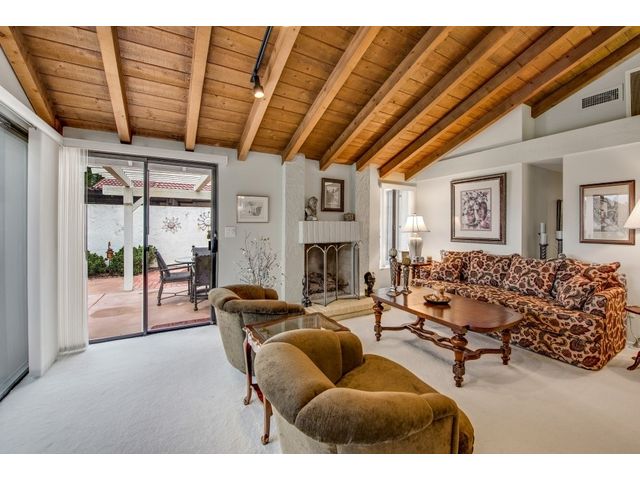 LOCATION! Rare 3-BR on the golf course with soothing views. Kitchen remodeled with newer cabinets, counters, appliances & recessed lighting & glass slider to patio & golf course views. Living room & dining room have pitched wood ceilings. LR has 2 glass sliders to patio with golf course views. Mstr BR has golf course views, ceiling fan & recessed lights, double vanity, walk-in closet and shower. 2nd BR has ceiling lights and 2nd BA is across the hall with newer cabinet & tub-shower combo.