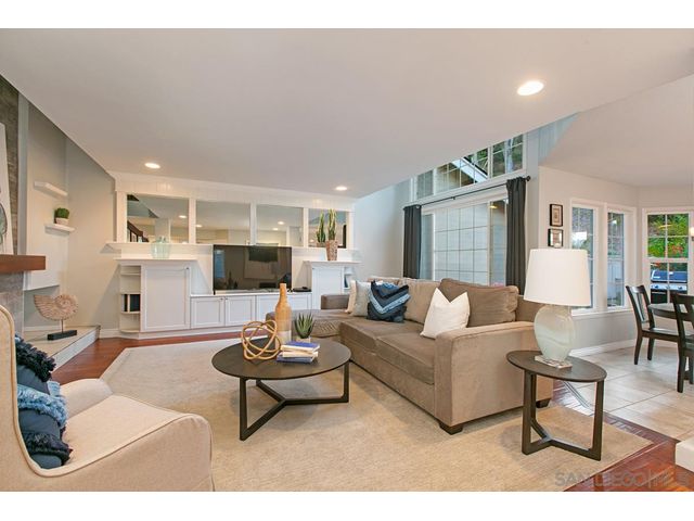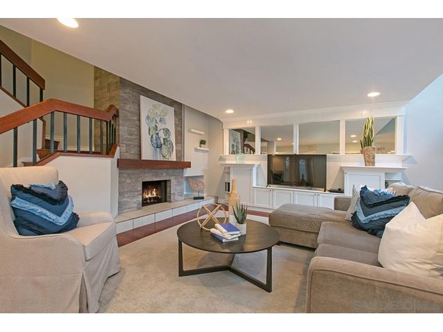 SWEOB $800,000-$830,000. Hidden Gem WEST of I-5 Freeway! Upgraded twinhome in desirable, gated community of Leucadia Village. This turn-key home, with three bedrooms, two baths, plus 120 sqft loft, features a dramatic floor to ceiling tiled fireplace, vaulted ceilings, and hardwood floors in living room. Upgraded kitchen; stylish, farm sink and pendant light, granite counters, full backsplash, and LG refrigerator and dishwasher. French doors lead to spacious, private patio, backing to natural space.