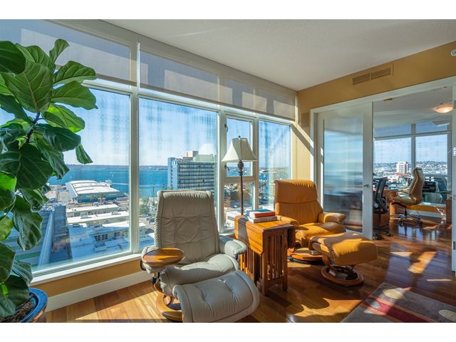 Discover the most sought-after floor plan of Downtown San Diego. The middle unit at the Grand South. This west orientation unit provides breathtaking views to the bay and the pacific ocean. Water and city views from every room and both bedrooms. Two balconies to enjoy the views, one of the master bedroom. This unit comes with 2 bed and two bath and bonus room for an office or den. Custom paint, hardwood floors, kitchen custom cabinetry to complement original kitchen design.