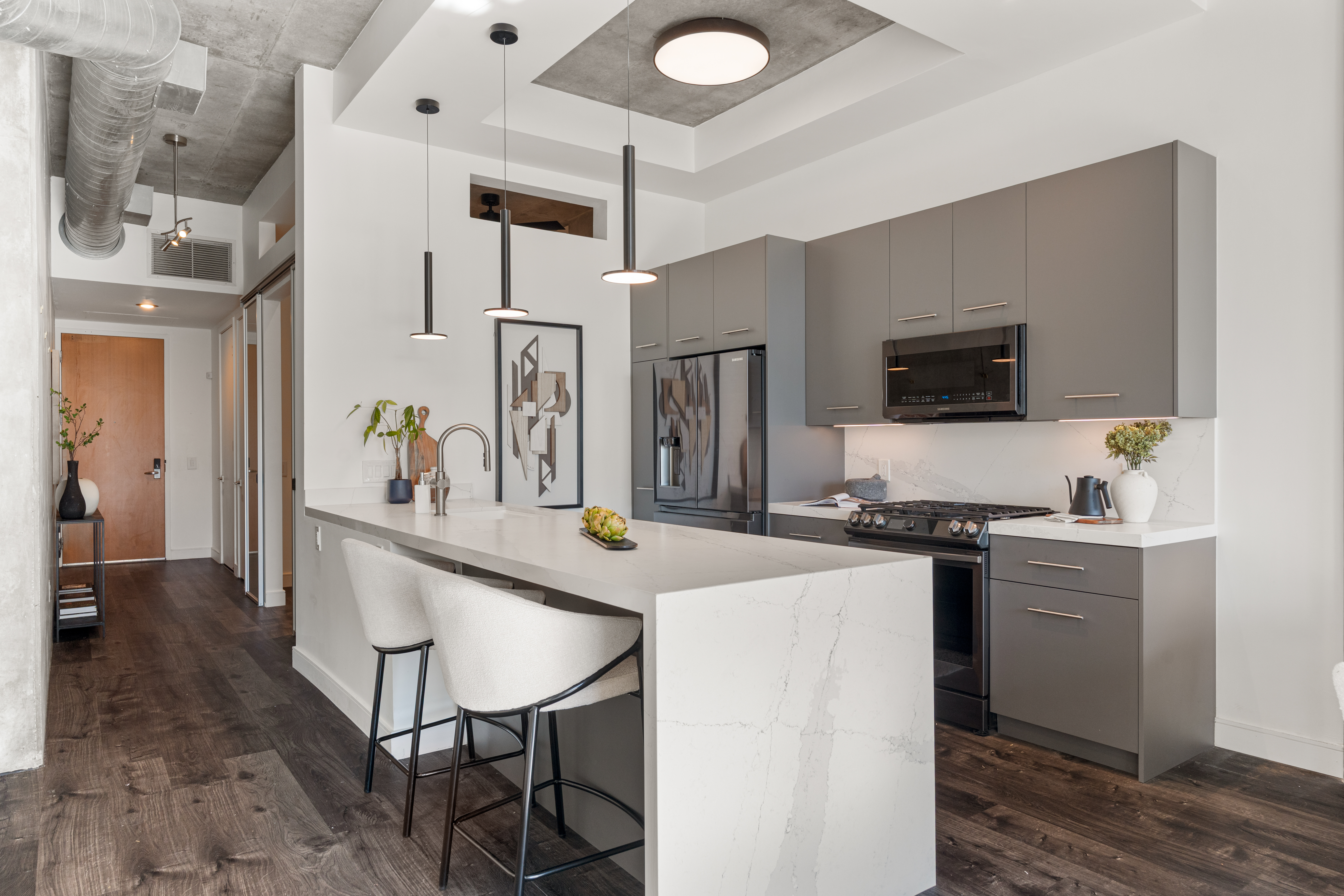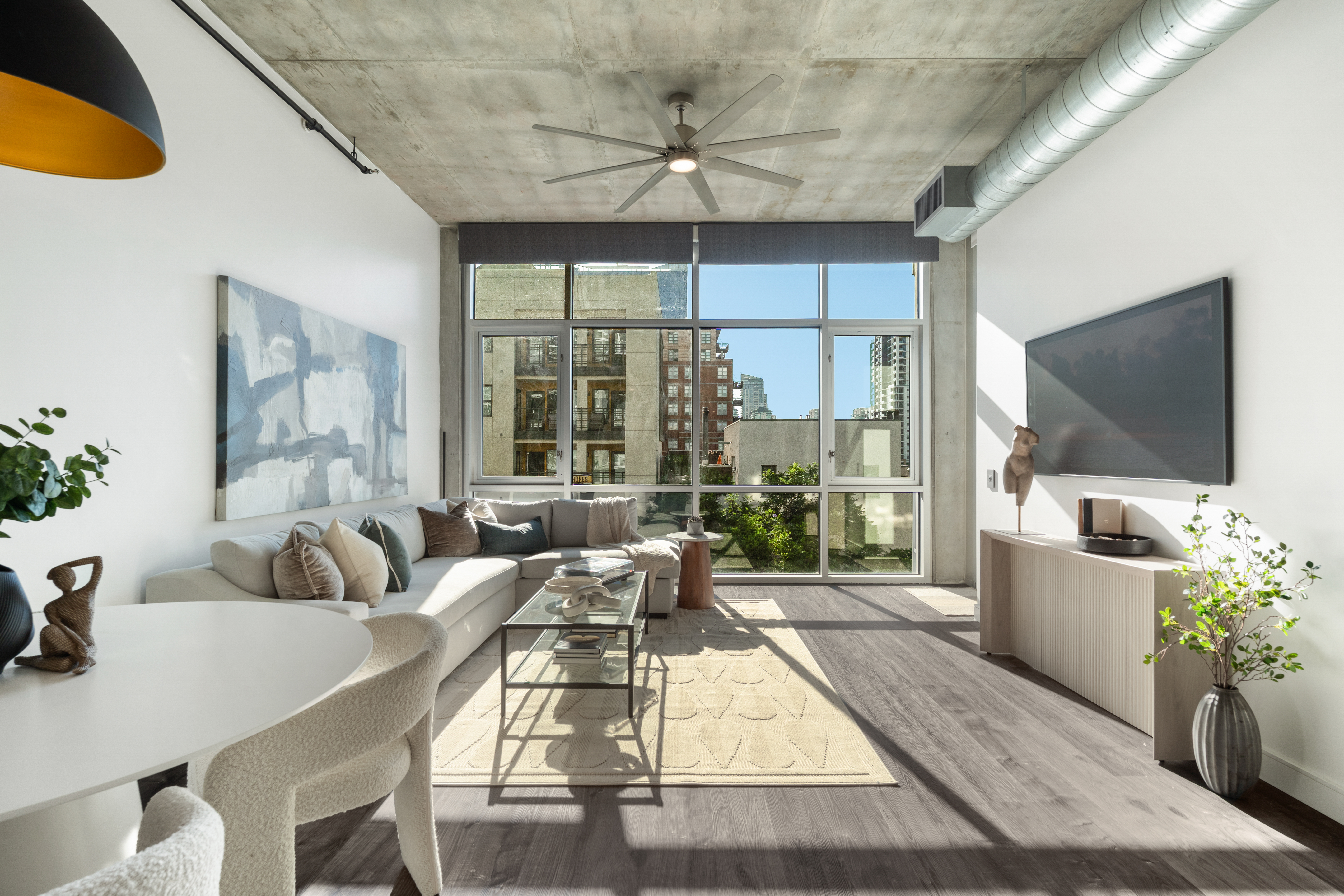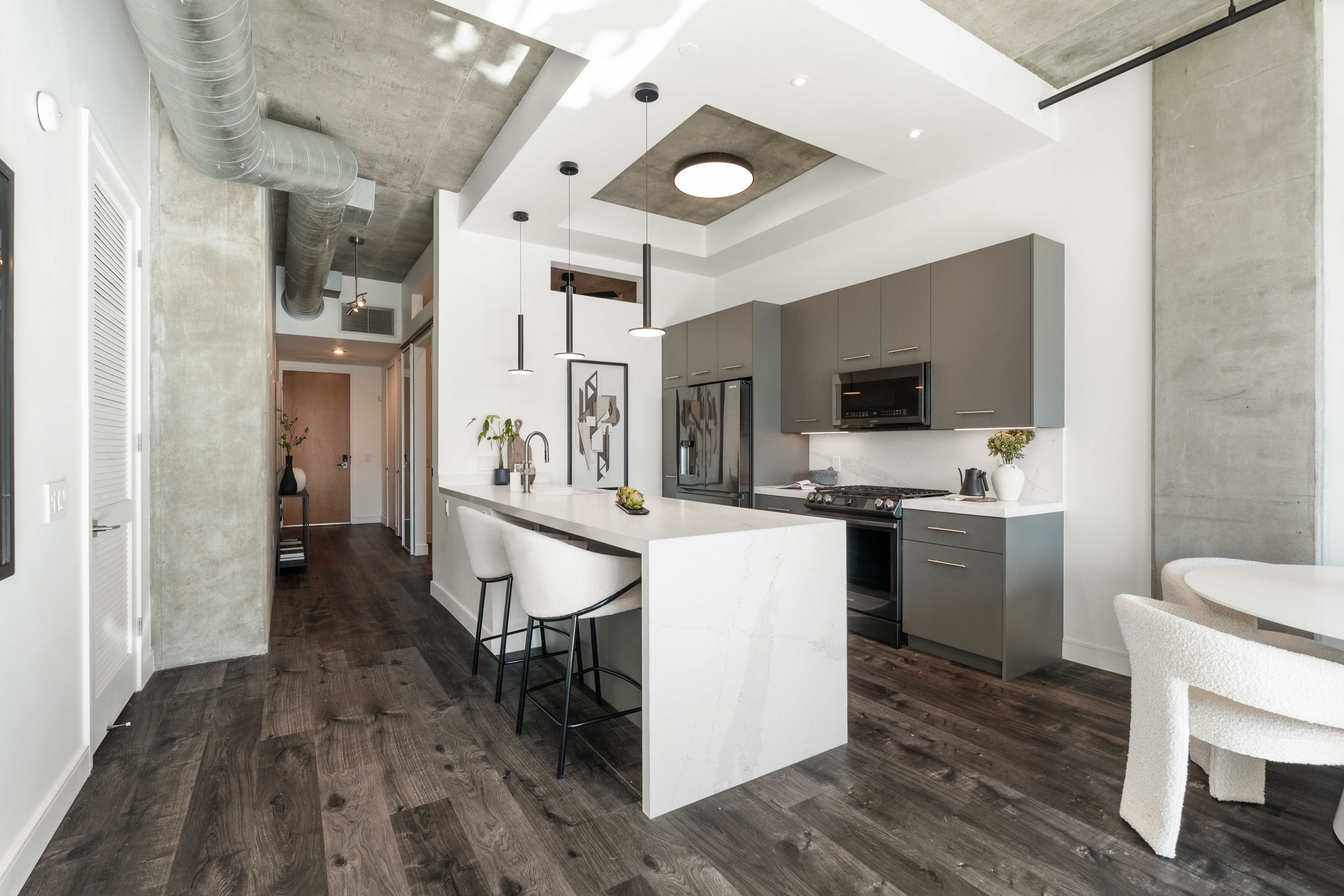 Step into a fully upgraded condominium in the heart of East Village. Designed by a principal of a respected interior design firm, this home has been thoughtfully updated with attention to detail. The open floor plan features recessed LED lighting and durable laminate flooring. At the center of the home, the kitchen is equipped with Euro-style cabinetry, Silestone countertops with a waterfall edge, and under-cabinet lighting for a clean, modern look.