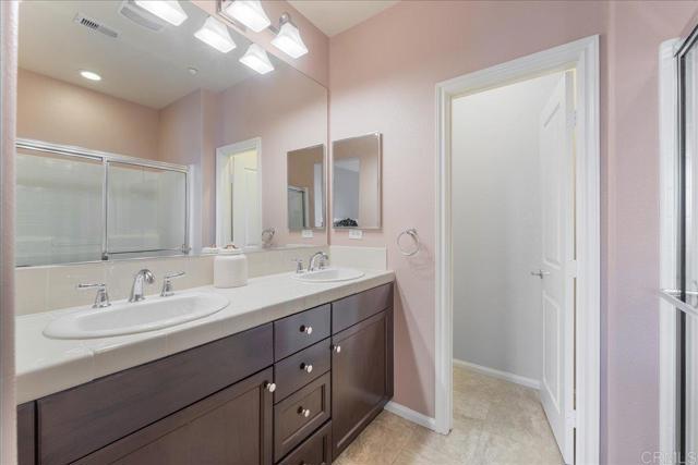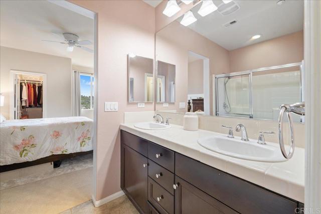 New Price Enhancement: Nestled in the desirable Magnolia community of Old Creek Ranch, this meticulously maintained townhome offers a blend of modern comfort and serene living. Built in 2014, this residence is situated in a rare perimeter location, providing enhanced privacy and stunning west-facing views that capture breathtaking sunsets. Inside, the open-concept floor plan showcases a modern kitchen upgraded with granite countertops, stainless steel appliances, and a breakfast bar that flows effortlessly into the spacious living area. Elegant touches like upgraded backsplash, custom window coverings, and new hardware throughout create a polished, designer feel. The sellers have added numerous thoughtful improvements, ceiling fans, and fresh paint, making this home truly move-in ready. Upstairs, both bedrooms feature their own ensuite bathrooms, enhanced with upgraded fixtures and finishes for maximum comfort and convenience. The in-unit laundry is ideally located on the same level. Additional highlights include durable tile flooring, recessed lighting, central air conditioning, and an attached two-car garage with ample storage space, upgraded with epoxy flooring and overhead racks for organization. Residents of Magnolia at Old Creek Ranch enjoy resort-style amenities, including a pool, spa, BBQ area, fire pit, playground, and scenic walking trails. The HOA covers water and exterior maintenance, ensuring a low-maintenance lifestyle. Located just minutes from San Elijo Hills Town Center, award-winning schools, parks, local trails, shopping, dining, and entertainment options, this home perfectly combines comfort, convenience, and location.