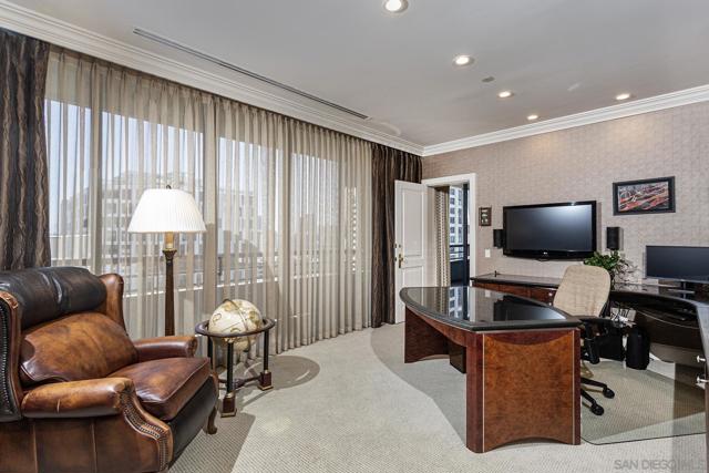 Impeccably crafted with refined details rivaling the most exclusive of urban mansions, this sophisticated MERIDIAN home of over 4,100 square feet dazzles at every turn. From the classical use of crown moldings, exquisite cabinetry, and wood inlay flooring to the artfully lit hallway for showcasing personal treasures and art, the custom William Ohs gourmet kitchen, and exquisite designer finishes throughout, this inviting, one-of-a-kind residence is a showcase in sophisticated living. The seamless flow of expansive living areas accommodates multiple layout options for lavish large-scale or intimate experiences. Two generous, inviting terraces overlooking the amenity-rich 2/3-acre outdoor plaza offer panoramic views of the sparkling San Diego Bay, Pt. Loma, and city lights. Separated for privacy are two elegant primary suites, an optional bedroom/office, a secondary entrance, a laundry/home center, two balconies, and more. Classically designed with abundant storage and beautifully maintained top-of-the-line details throughout. This gracious, stunning home is a must-see to truly appreciate all of the refined details. Don't miss this opportunity to enjoy the best of city living within the five-star-caliber MERIDIAN Condominiums community. Please see the supplement for more lifestyle and service details. Thank you. Enjoy every amenity MERIDIAN Condominiums has to offer amidst the comfort and convenience of downtown, San Diego living. MERIDIAN CONDOMINIUMS,a landmark residential community, deliberately conceived and impeccably crafted remains without peer. Incomparable services are offered by an attentive staff consisting of 24 hour ParkingAttendants for Residents and their Guests, Door Person, Porter, Concierge and more. A completely separate service entry with loading dock and service elevator is staffed with Porters to accept packages, deliveries and tradespeople. For your convenience, groceries, packages, dry cleaning, luggage and more can be delivered to your door! Impeccably maintained, pride of ownership abounds. Whether you are entertaining on a grand scale or merely relaxing by the sparkling pool, MERIDIAN’s accommodations are sure to exceed your needs. The MERIDIAN Room, designed with a catering kitchen, bar, cloakroom, and restrooms offers an elegant entertaining environment for both large scale and intimate parties. Elegant formal gardens, a grove of citrus trees, an outdoor spa and adjoining fire pit complement the inviting pool and lounging/sunning areas on the unique 2/3 of an acre plaza elevated above the city space. Other features adding to the convenience and comfort at MERIDIAN are two newly renovated spa and fitness facilities, five recently remodeled lovely Guest Suites to welcome visiting friends and family, specially curated private art gallery, and conference room ideal for business meetings and presentations or small-scale entertaining. At the foot of MERIDIAN, lies Meridian Place, offering a myriad of fine retailers to conveniently complete the needs of your lifestyle.Salon and spa services, cosmetic dentistry, dry cleaning, fine dining and much more are literally an elevator ride away. Take advantage of MERIDIAN’s premier downtown location and explore the countless restaurants, elegant shopping, cultural attractions and miles of scenic pathways. Enjoy a lifestyle that is without parallel . . .enjoy MERIDIAN living!