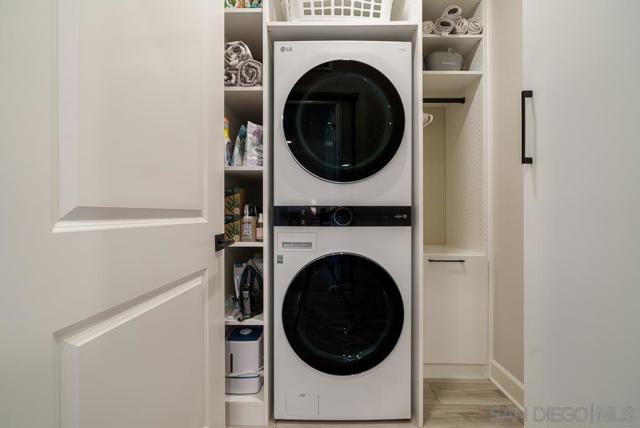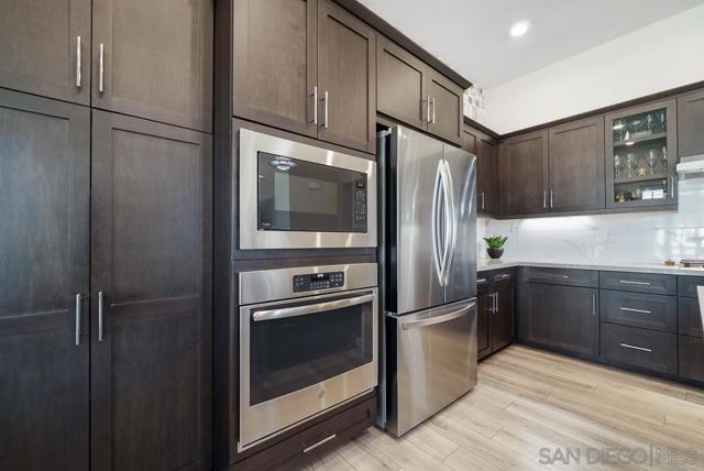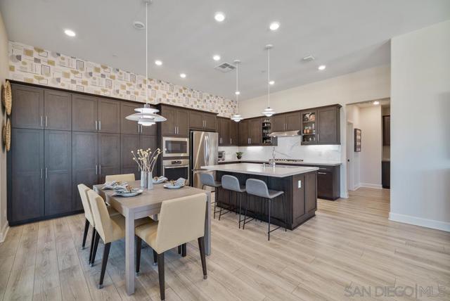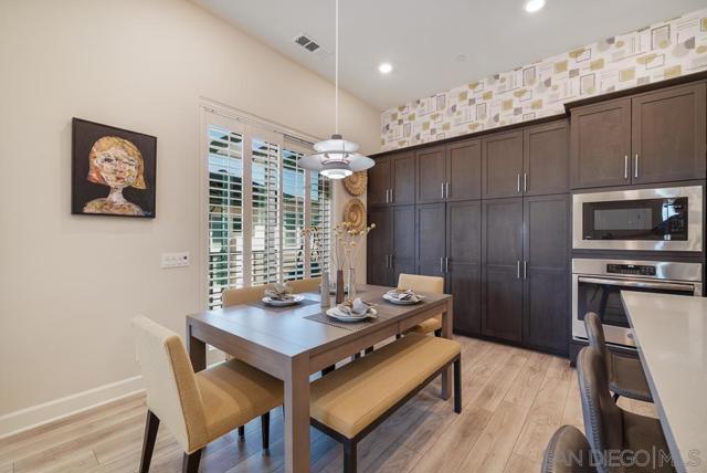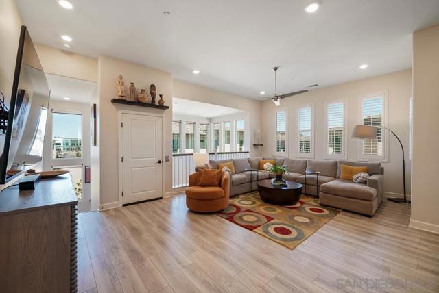 Character and elegance come together in this highly upgraded Plan 4 home in Avante at Del Sur, ideally located in the heart of Del Sur. Offering 2 bedrooms + den, 2.5 bathrooms, and 1,787 sq ft, this light-filled residence features Pecorino LVP flooring, Shadow Tuftex carpet, wood shutters, motorized silhouette shades, modern ceiling fans, built-in closets, and a beautifully customized laundry room. Upon entry, you're welcomed by soaring ceilings and a versatile first-floor den with a steel-frame sliding glass door that adds a... striking modern industrial touch—perfect for a home office or flex space. Continue upstairs by staircase or your own private in-home elevator to the spacious great room designed for effortless living and entertaining. The chef-inspired kitchen showcases smoke shaker cabinetry, Tullamore quartz countertops, a glossy wide-plank tile backsplash, stainless steel GE appliances, European soft-close drawers, glass display cabinetry, and modern pendant chandeliers. Bathrooms feature Denali White quartz counters, designer tile backsplashes, and Emser shower tile, while statement wallpaper accents add stylish character throughout the home. Additional highlights include a private balcony and a full-size LG stackable washer/dryer, built-in shelving, hamper, and extra storage in the laundry room. Enjoy a true lock-and-leave lifestyle with Baldwin smart lock, Ring doorbell, smart thermostat, smart lighting, and upgraded WiFi. Residents of Avante enjoy a private clubhouse, pool, spa, fire pit, and social events, plus access to Del Sur’s 11 pools, 14 parks, and events. Tremendous value throughout!