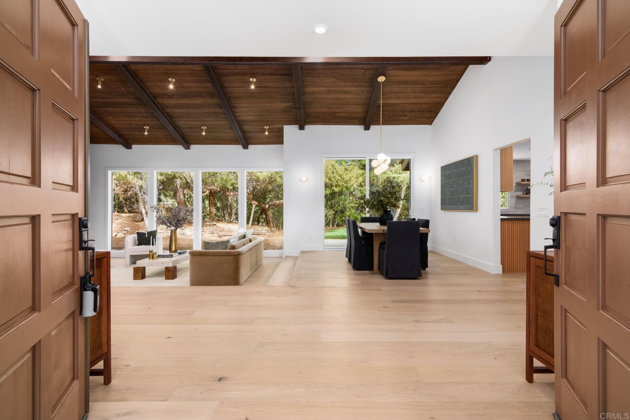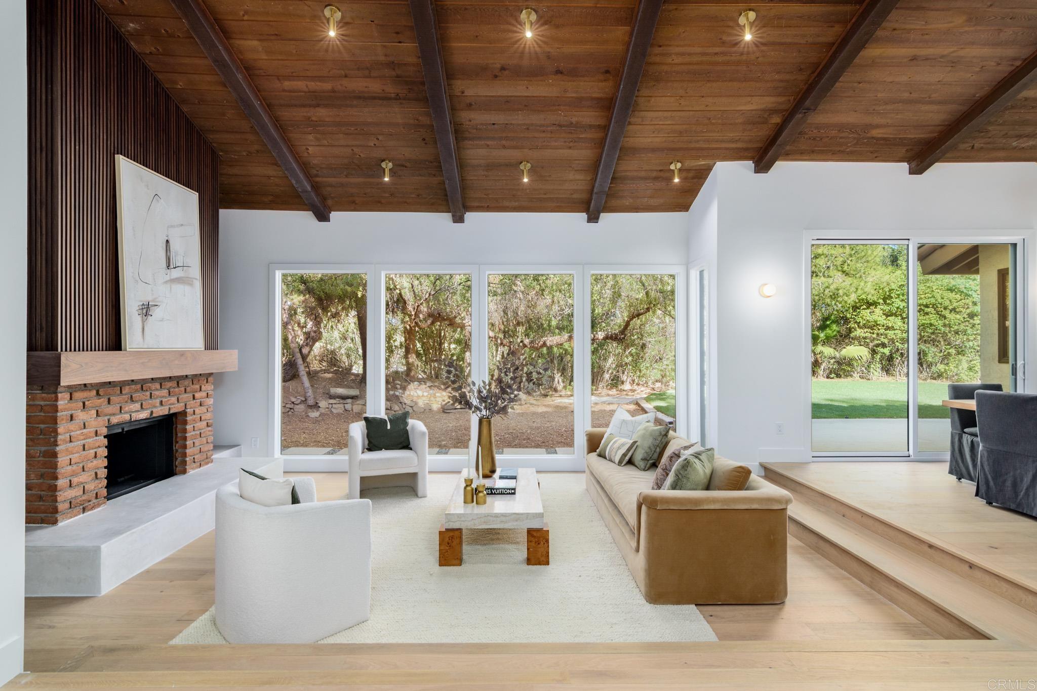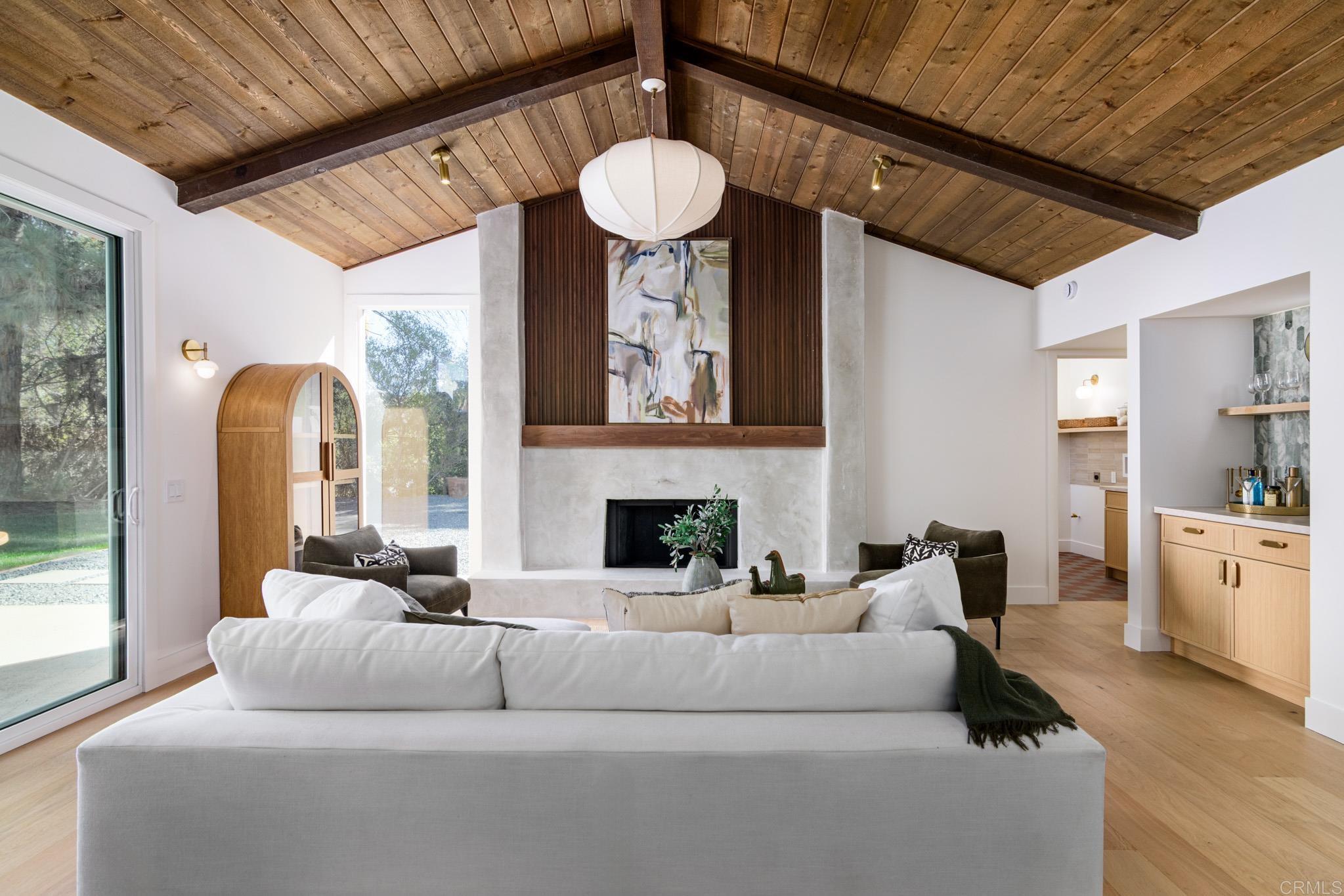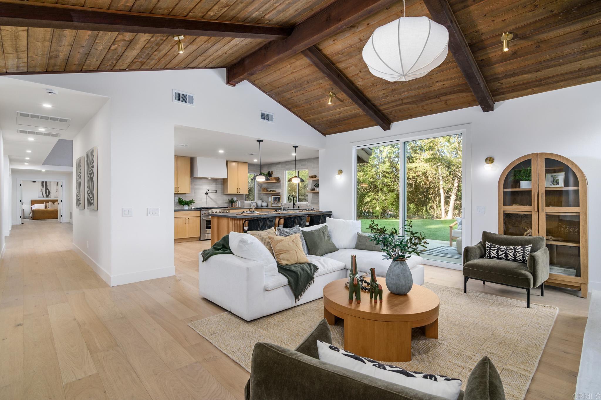This fully remodeled mid-century modern ranch home combines quality craftsmanship with single-level convenience on a private half-acre in the Poway Unified School District. Vaulted wood-beamed ceilings, large windows, and sliding doors bring natural light and outdoor views throughout the home. Separate living and family rooms provide flexible spaces, each finished with planked ceilings, designer fixtures, and modern fireplaces that emphasize the home’s cohesive design. In the kitchen, slim shaker white oak cabinetry pairs with grey leather quartz countertops, premium appliances, and counter-to-ceiling tile backsplash for a clean, elevated look. A dry bar enhances functionality, while nearby spaces open directly to the backyard for easy indoor-outdoor flow. A dedicated dining area ties the main living areas together with warm, streamlined finishes. The primary suite continues the vaulted wood-beamed ceilings and offers clear views of the backyard. Its spa-style bath features a wet room with a freestanding soaking tub and oversized shower, finished in neutral, refined materials. Dual vanities, designer finishes and a generous walk-in closet complete the suite. Additional bedrooms are set within their own wing, accompanied by a modern hall bath with green tilework and a bold designer powder room. A private office with French doors creates an ideal workspace, and the laundry room adds convenience with designer tile, floating shelves, and a utility sink. Mature trees, multiple patios, and open sections of the half-acre lot offer room for future personalization while maintaining a low-maintenance, peaceful environment. Move-in ready and meticulously updated, this property delivers refined mid-century style, quality materials, and a calm, functional layout—an ideal fit for those seeking comfort, privacy, and access to top-rated Poway schools.