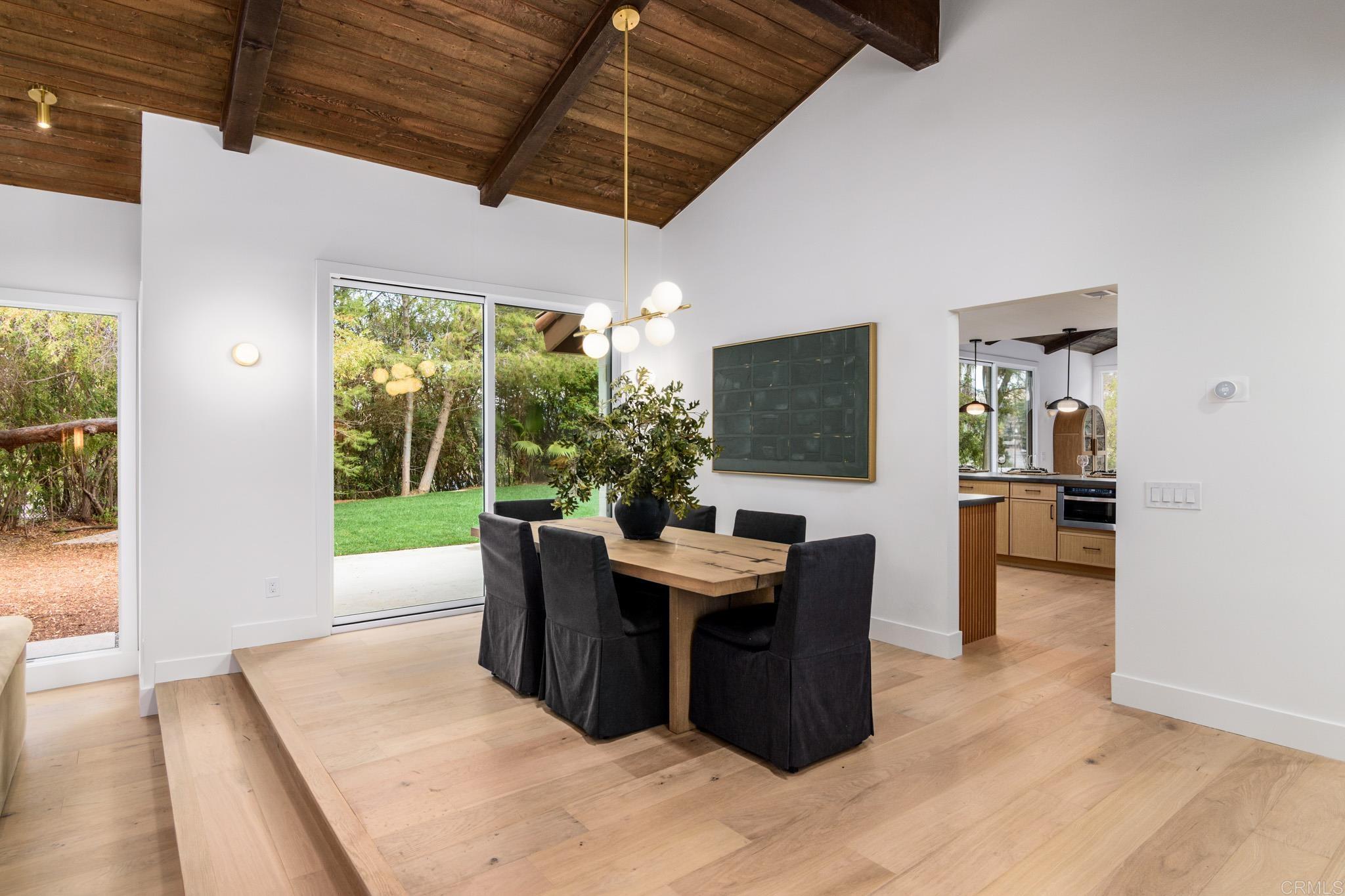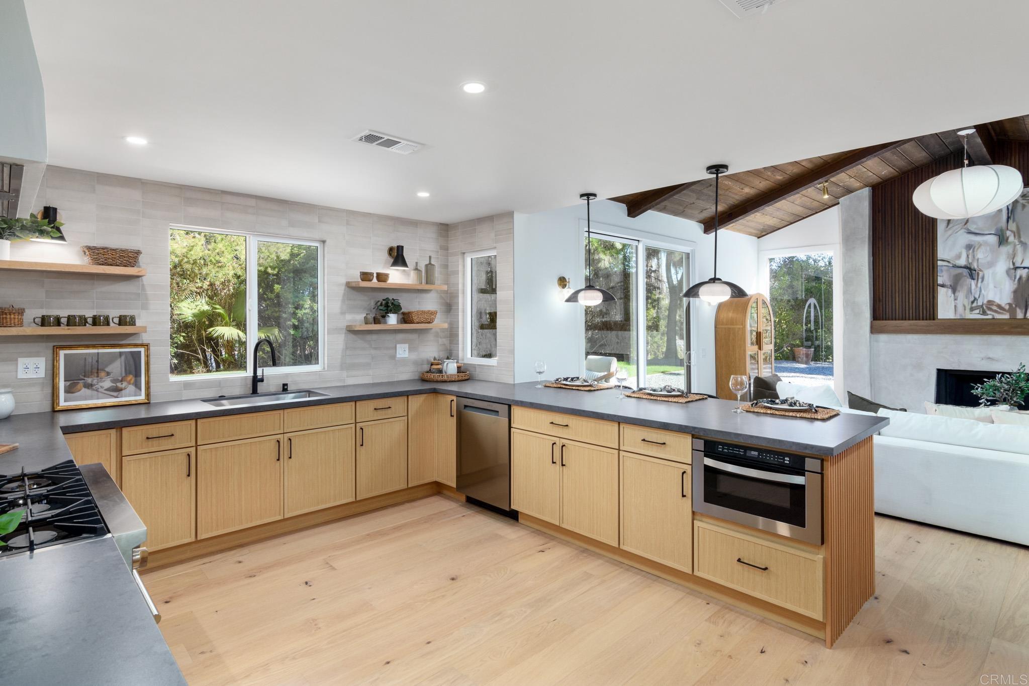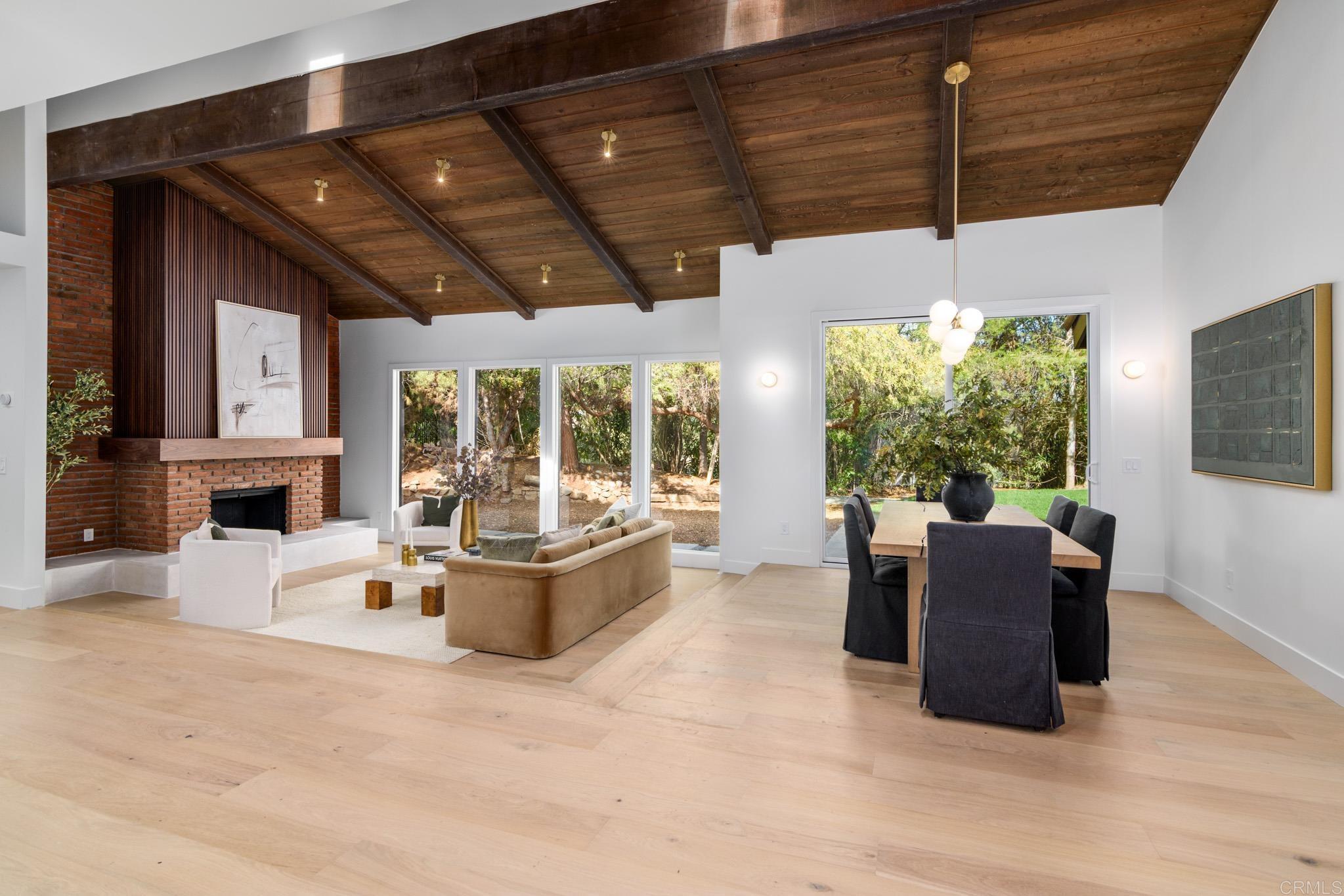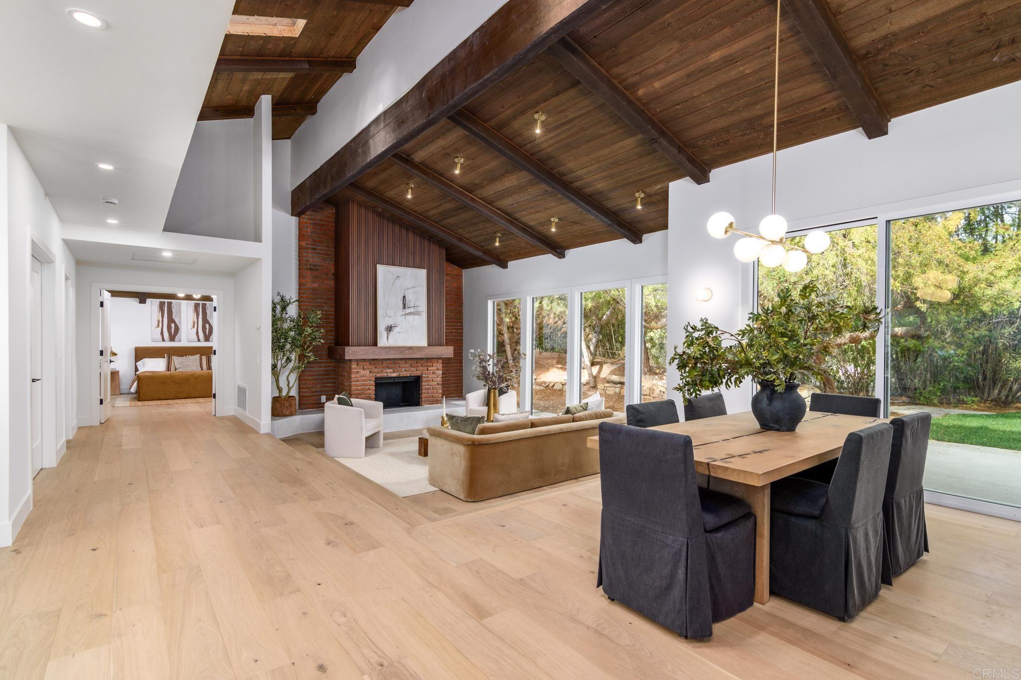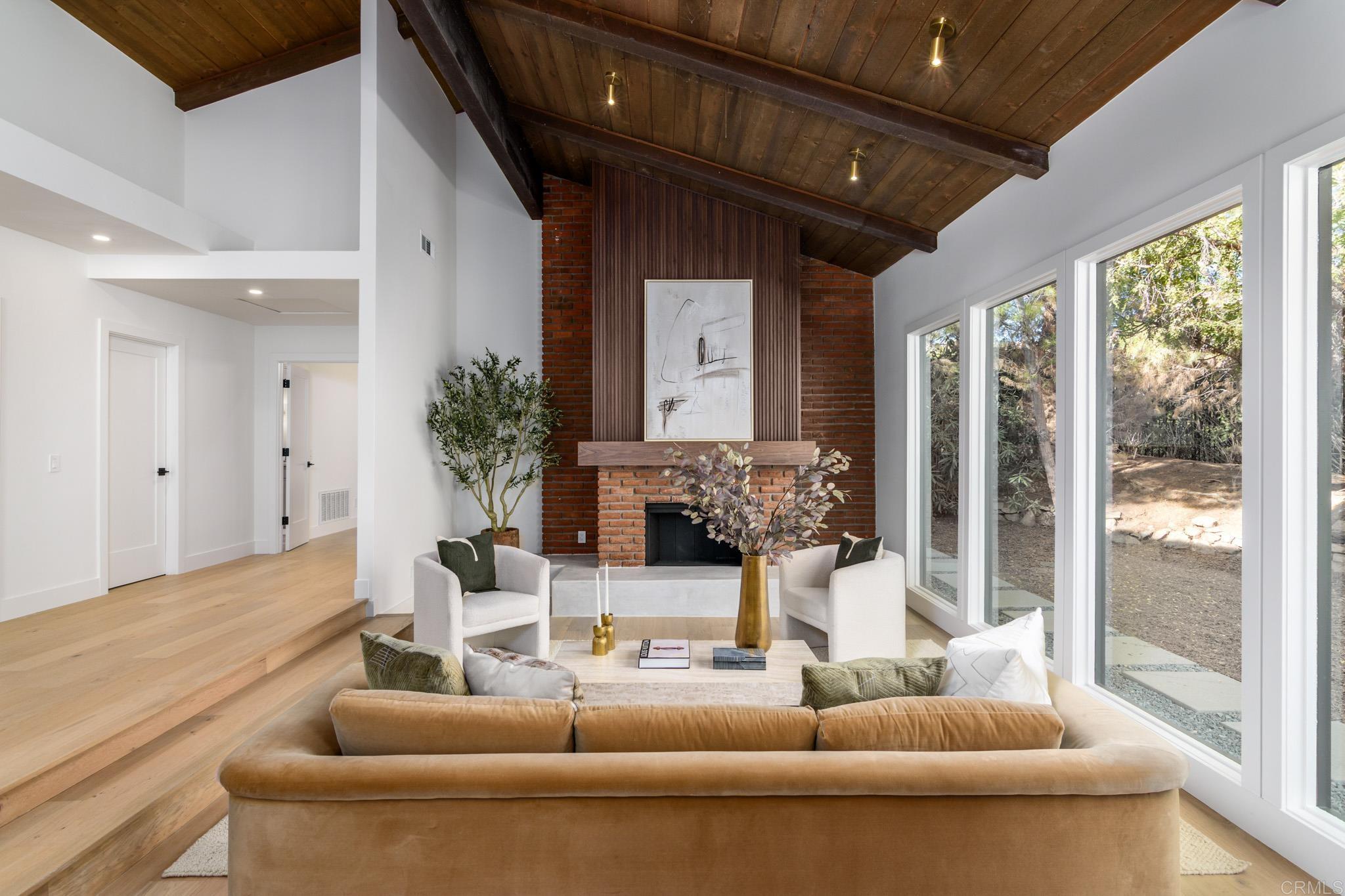 This fully remodeled mid-century modern ranch home combines quality craftsmanship with single-level convenience on a private half-acre in the Poway Unified School District. Vaulted wood-beamed ceilings, large windows, and sliding doors bring natural light and outdoor views throughout the home. Separate living and family rooms provide flexible spaces, each finished with planked ceilings, designer fixtures, and modern fireplaces that emphasize the home’s cohesive design. In the kitchen, slim shaker white oak cabinetry pairs with grey leather quartz countertops, premium appliances, and counter-to-ceiling tile backsplash for a clean, elevated look. A dry bar enhances functionality, while nearby spaces open directly to the backyard for easy indoor-outdoor flow. A dedicated dining area ties the main living areas together with warm, streamlined finishes. The primary suite continues the vaulted wood-beamed ceilings and offers clear views of the backyard. Its spa-style bath features a wet room with a freestanding soaking tub and oversized shower, finished in neutral, refined materials. Dual vanities, designer finishes and a generous walk-in closet complete the suite. Additional bedrooms are set within their own wing, accompanied by a modern hall bath with green tilework and a bold designer powder room. A private office with French doors creates an ideal workspace, and the laundry room adds convenience with designer tile, floating shelves, and a utility sink. Mature trees, multiple patios, and open sections of the half-acre lot offer room for future personalization while maintaining a low-maintenance, peaceful environment. Move-in ready and meticulously updated, this property delivers refined mid-century style, quality materials, and a calm, functional layout—an ideal fit for those seeking comfort, privacy, and access to top-rated Poway schools.