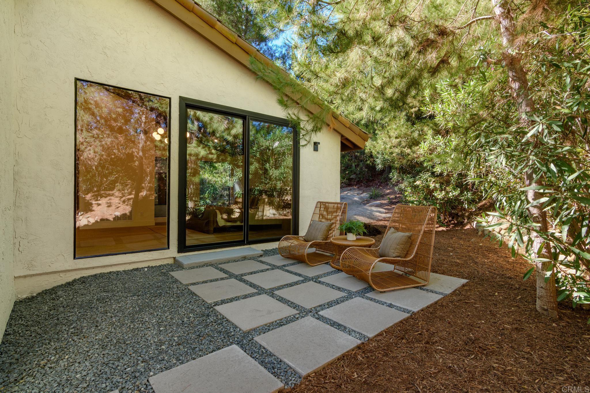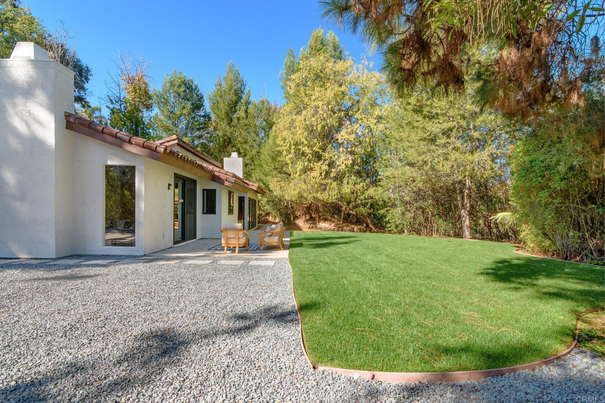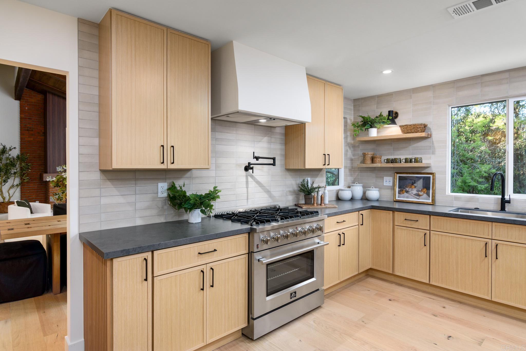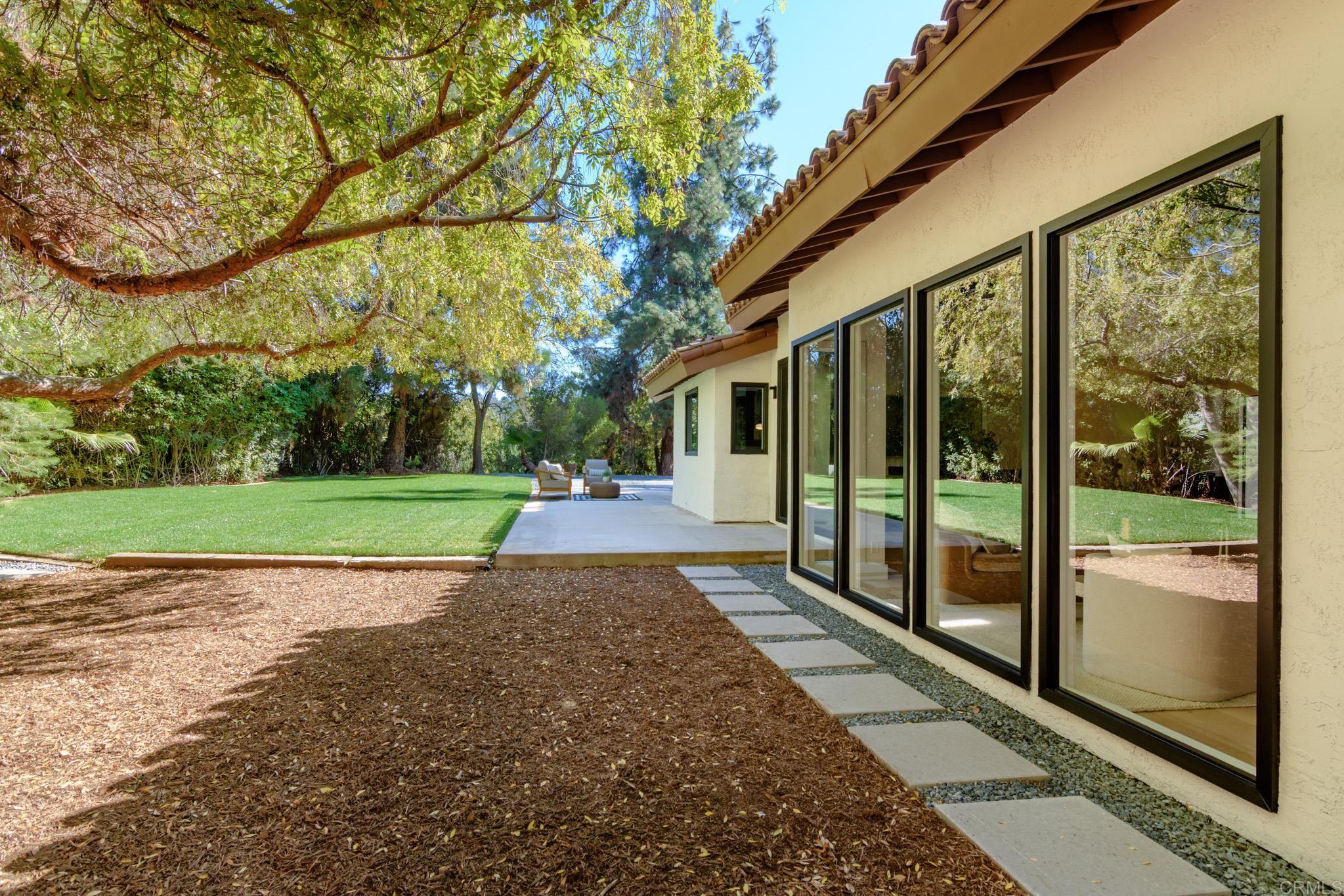 This fully remodeled mid-century modern ranch home combines quality craftsmanship with single-level convenience on a private half-acre in the Poway Unified School District. Vaulted wood-beamed ceilings, large windows, and sliding doors bring natural light and outdoor views throughout the home. Separate living and family rooms provide flexible spaces, each finished with planked ceilings, designer fixtures, and modern fireplaces that emphasize the home’s cohesive design. In the kitchen, slim shaker white oak cabinetry pairs with grey leather quartz countertops, premium appliances, and counter-to-ceiling tile backsplash for a clean, elevated look. A dry bar enhances functionality, while nearby spaces open directly to the backyard for easy indoor-outdoor flow. A dedicated dining area ties the main living areas together with warm, streamlined finishes. The primary suite continues the vaulted wood-beamed ceilings and offers clear views of the backyard. Its spa-style bath features a wet room with a freestanding soaking tub and oversized shower, finished in neutral, refined materials. Dual vanities, designer finishes and a generous walk-in closet complete the suite. Additional bedrooms are set within their own wing, accompanied by a modern hall bath with green tilework and a bold designer powder room. A private office with French doors creates an ideal workspace, and the laundry room adds convenience with designer tile, floating shelves, and a utility sink. Mature trees, multiple patios, and open sections of the half-acre lot offer room for future personalization while maintaining a low-maintenance, peaceful environment. Move-in ready and meticulously updated, this property delivers refined mid-century style, quality materials, and a calm, functional layout—an ideal fit for those seeking comfort, privacy, and access to top-rated Poway schools.