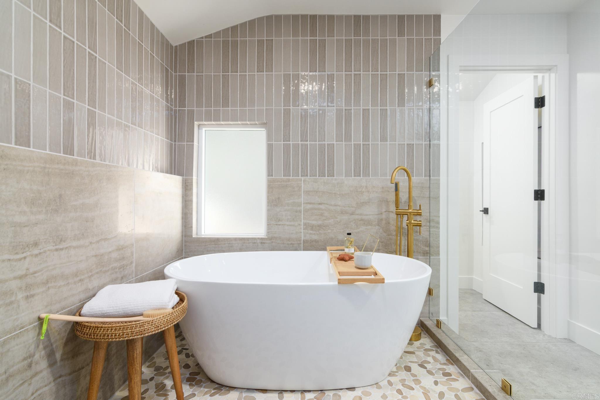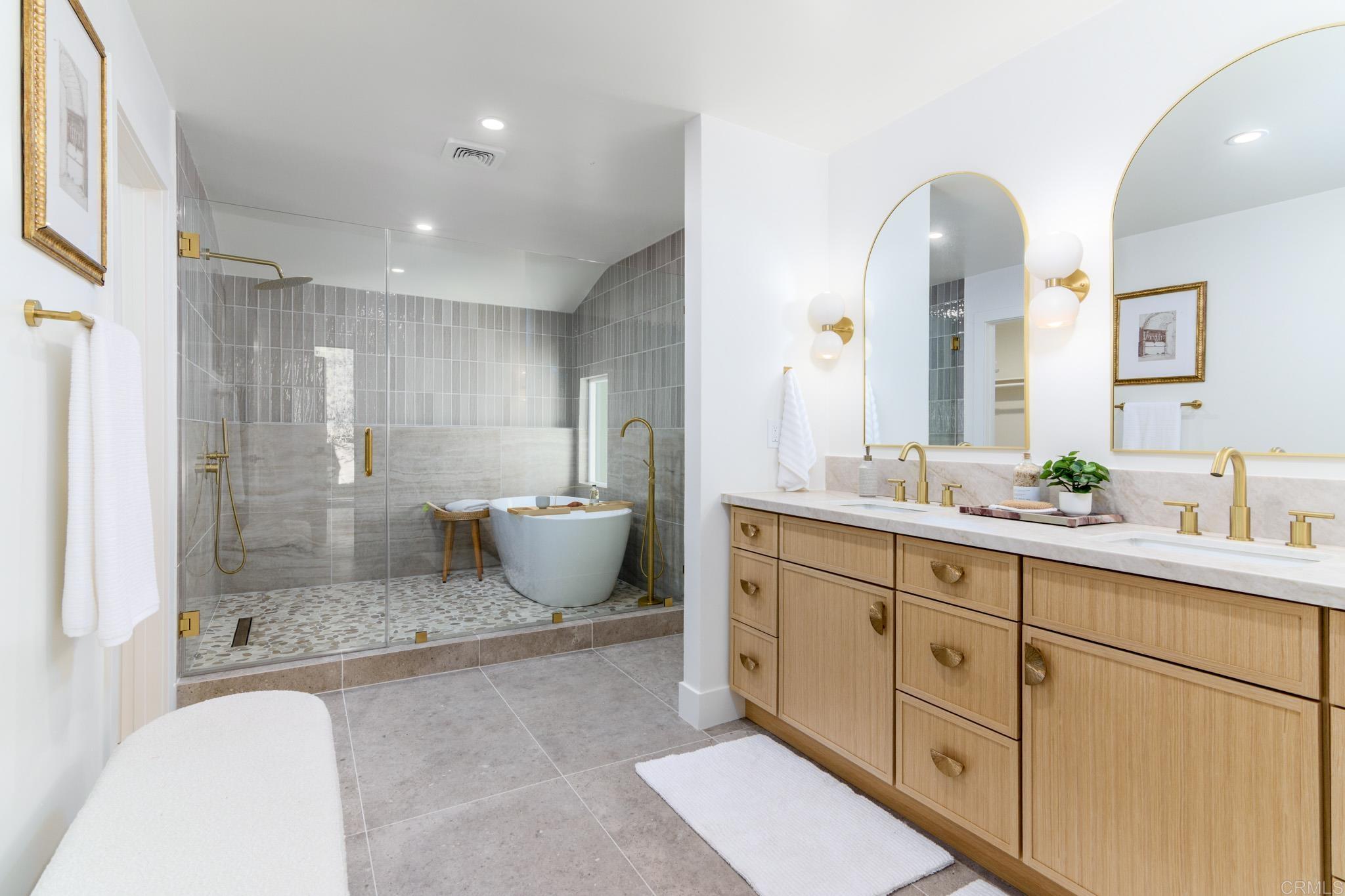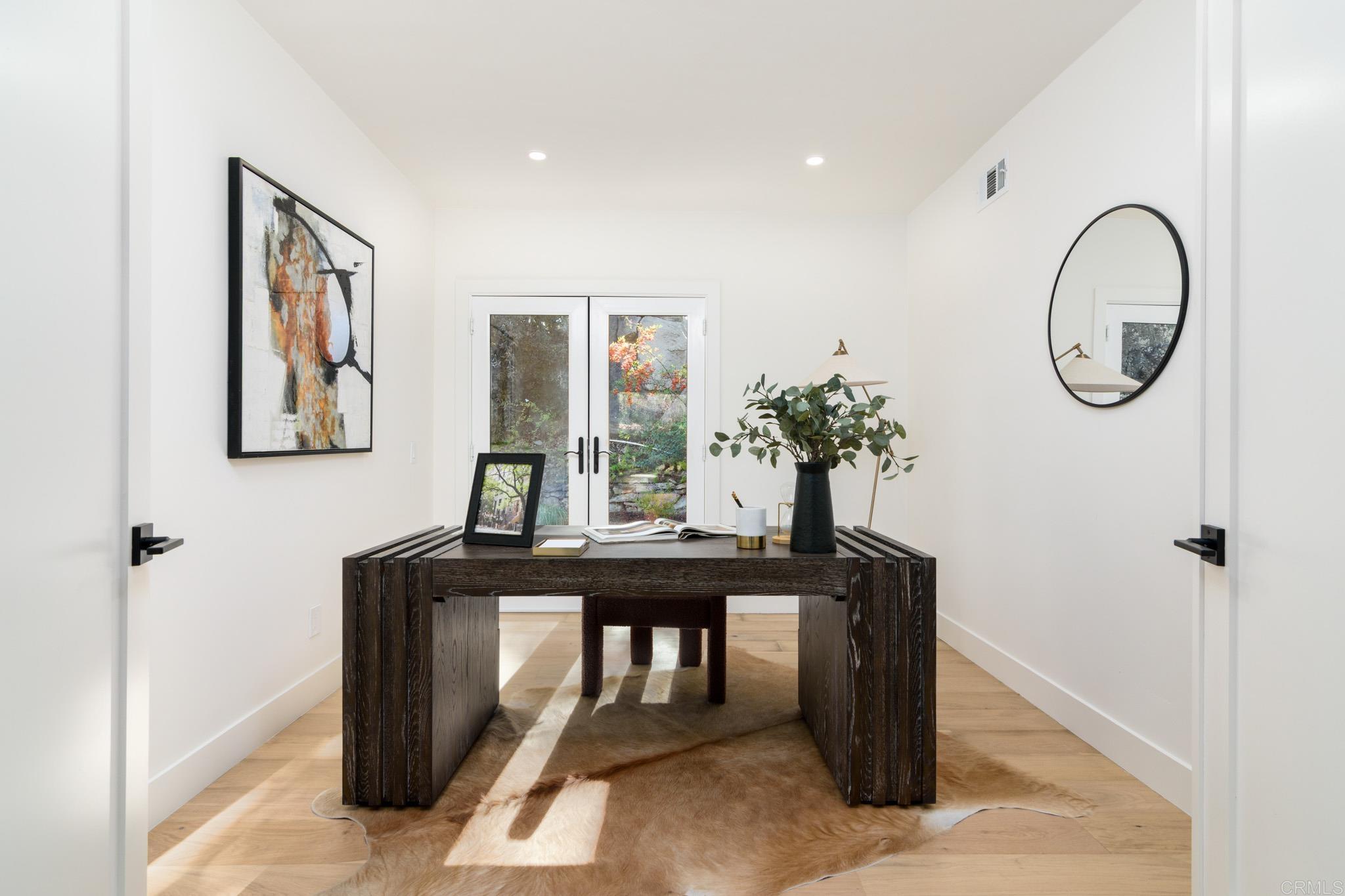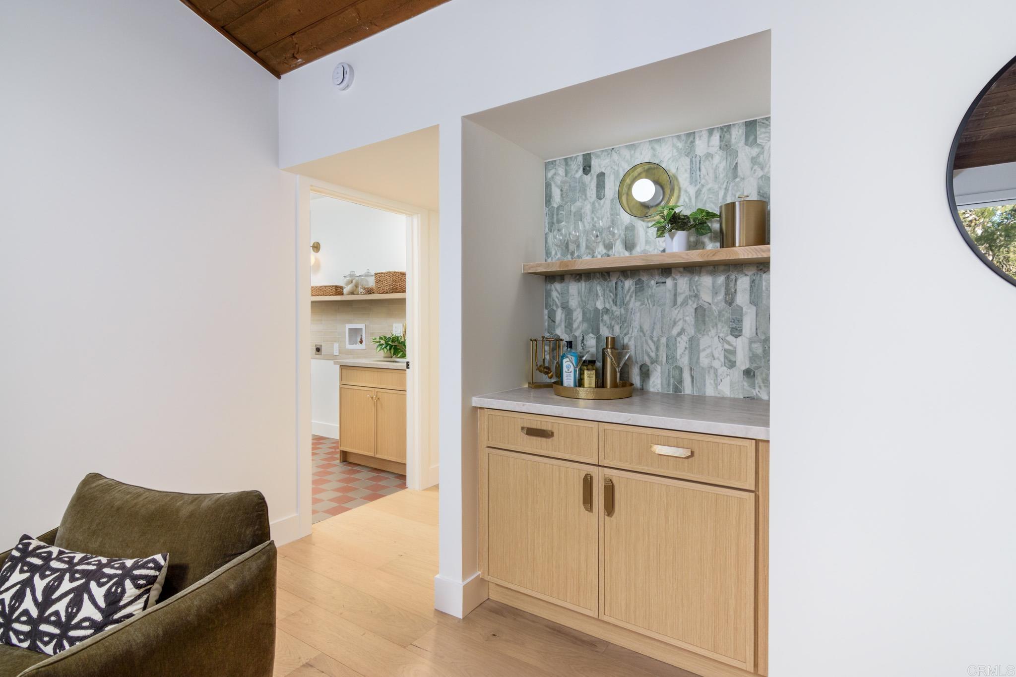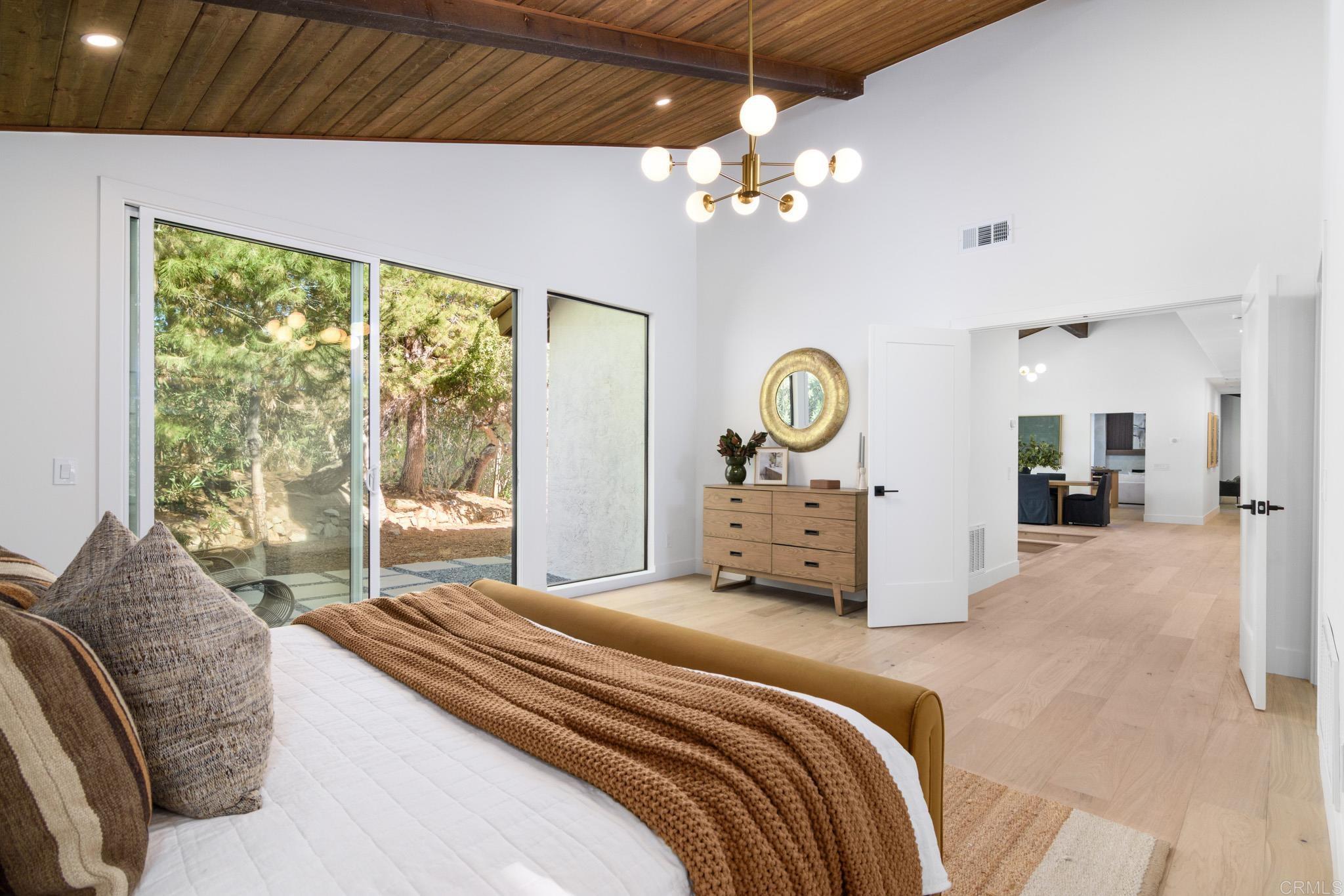 This fully remodeled mid-century modern ranch home combines quality craftsmanship with single-level convenience on a private half-acre in the Poway Unified School District. Vaulted wood-beamed ceilings, large windows, and sliding doors bring natural light and outdoor views throughout the home. Separate living and family rooms provide flexible spaces, each finished with planked ceilings, designer fixtures, and modern fireplaces that emphasize the home’s cohesive design. In the kitchen, slim shaker white oak cabinetry pairs with grey leather quartz countertops, premium appliances, and counter-to-ceiling tile backsplash for a clean, elevated look. A dry bar enhances functionality, while nearby spaces open directly to the backyard for easy indoor-outdoor flow. A dedicated dining area ties the main living areas together with warm, streamlined finishes. The primary suite continues the vaulted wood-beamed ceilings and offers clear views of the backyard. Its spa-style bath features a wet room with a freestanding soaking tub and oversized shower, finished in neutral, refined materials. Dual vanities, designer finishes and a generous walk-in closet complete the suite. Additional bedrooms are set within their own wing, accompanied by a modern hall bath with green tilework and a bold designer powder room. A private office with French doors creates an ideal workspace, and the laundry room adds convenience with designer tile, floating shelves, and a utility sink. Mature trees, multiple patios, and open sections of the half-acre lot offer room for future personalization while maintaining a low-maintenance, peaceful environment. Move-in ready and meticulously updated, this property delivers refined mid-century style, quality materials, and a calm, functional layout—an ideal fit for those seeking comfort, privacy, and access to top-rated Poway schools.